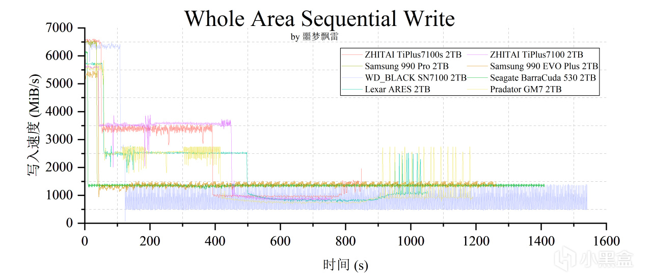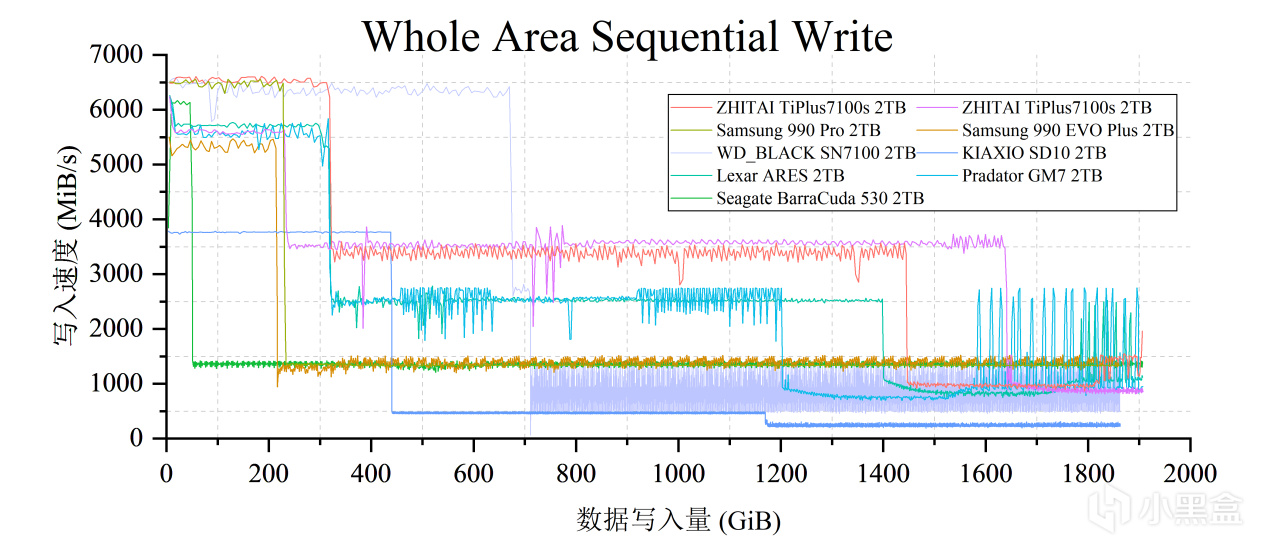 刚才我们提到,不同产品的顺序写入方案也各有不同,这也导致全盘写入曲线会有两段式、三段式等不同表现(有兴趣的话可以参考前几天我发布的《60款消费级SSD全盘顺序写入曲线图汇总》)。