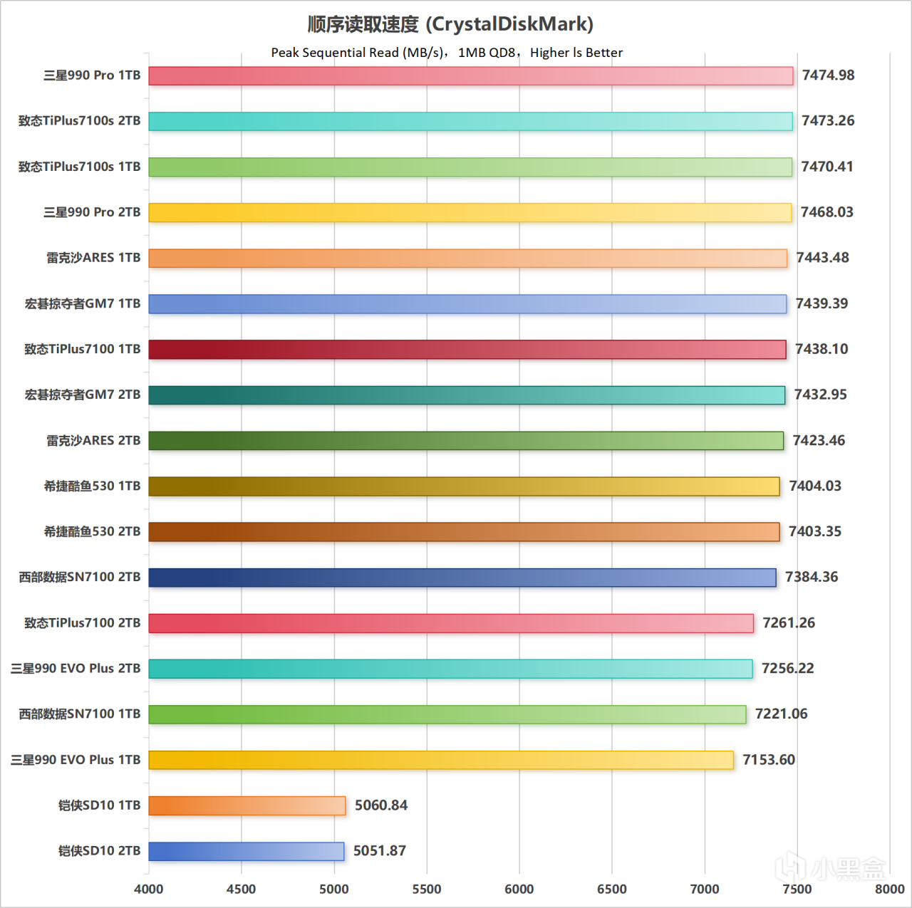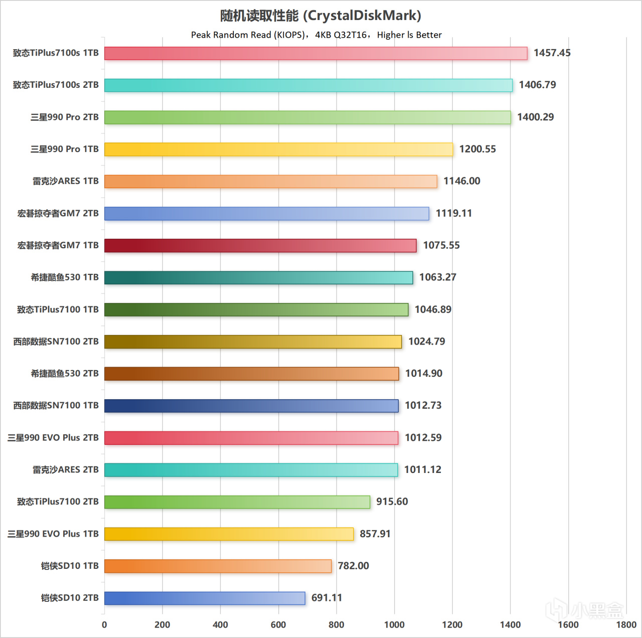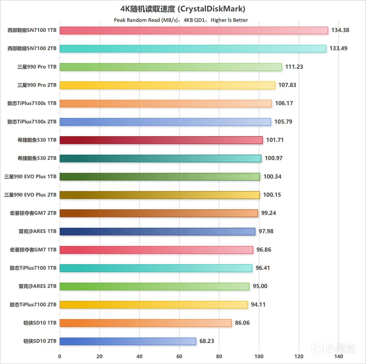 在CrystalDiskMark测试环节中,玩家们普遍最关心的还是QD1下的4K随机读取速度,该项结果的天梯排名如下: