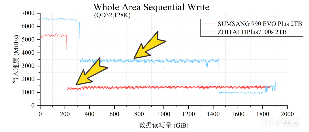 需要注意的是,以上顺序写入速度均为SLC Cache加速得来,消费级SSD在SLC Cache耗尽后写入速度会明显下降,后文中还有专门的天梯图予以体现。
