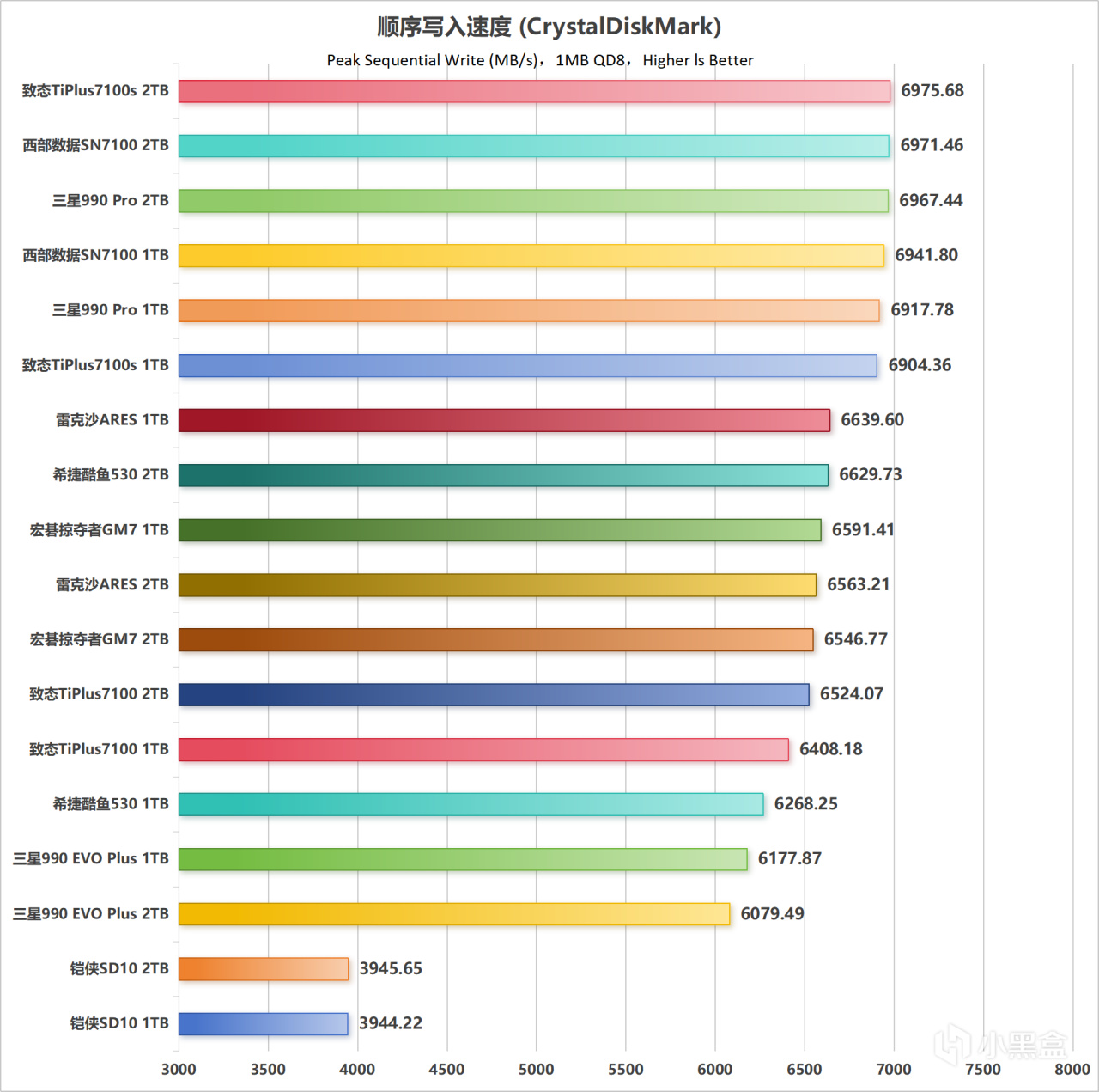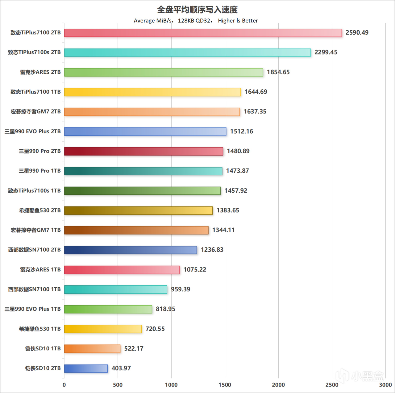不过总的来说,甭管是几段式写入,全盘平均顺序写入速度都是一个能够统一变量的考察角度。重度写入用户可以借此来选择适合自己的SSD产品,所以这里也将128K QD32下的顺序写入测速结果整理出如下天梯图: