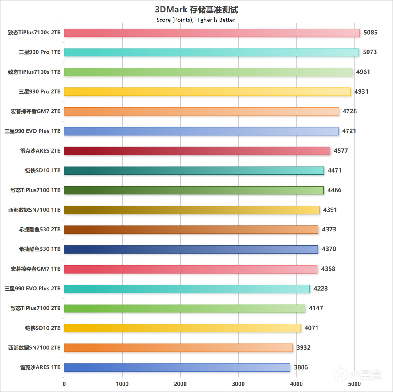 所以在CrystalDiskMark的顺序读写部分,我使用了AMD硬件平台的测试结果,其余测试项目均基于Intel平台的测试结果排序。
