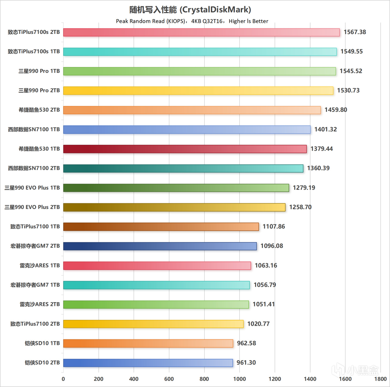 通过CrystalDiskMark测得的随机写入(4KB Q32T16)速度天梯图如下所示:
