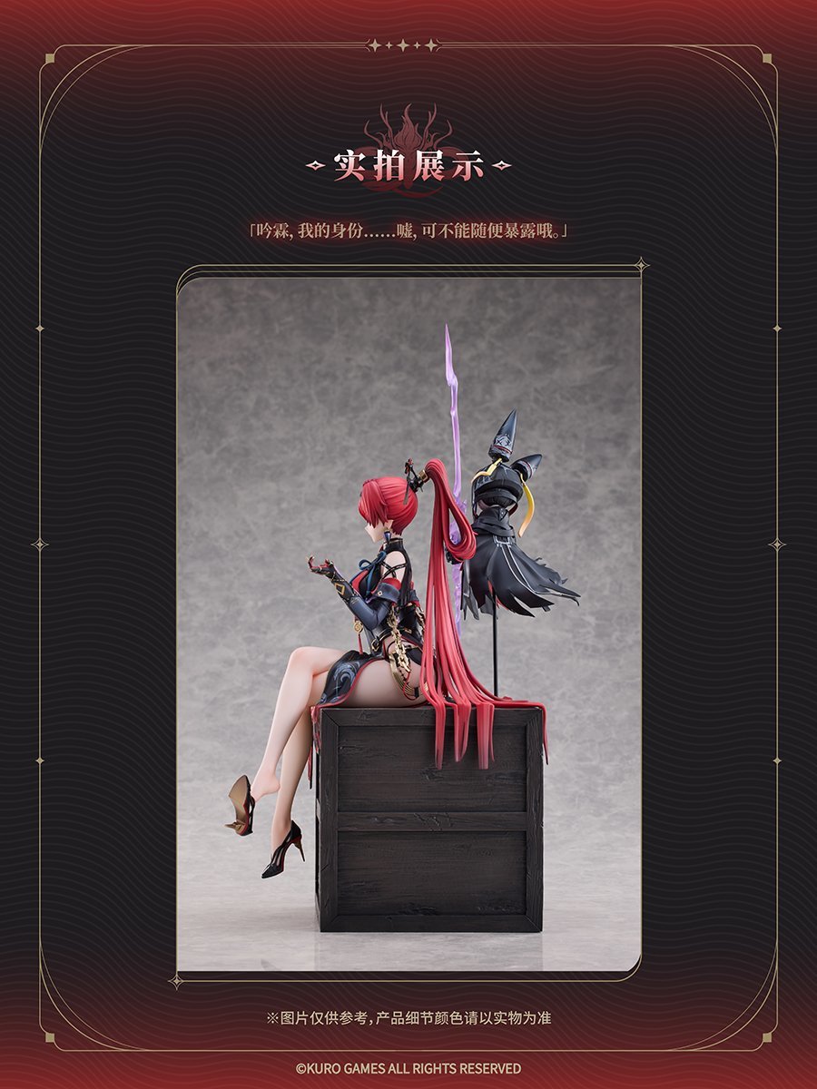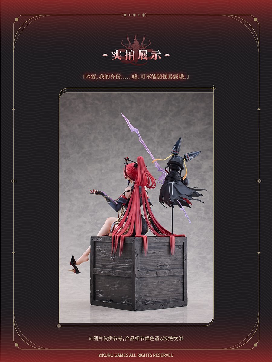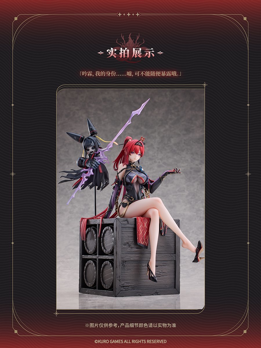 手办原型为鸣潮角色吟霖,呈现其标志性的红黑配色造型,搭配专属场景与配件