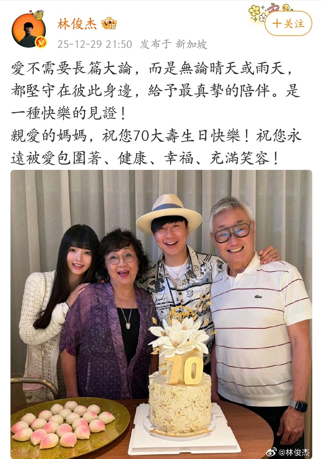 林俊杰晒出和女友一起陪妈妈庆生的温馨合照,正式官宣恋情。JJ写到:“亲爱的妈妈,祝您 70 大寿生日快乐!祝您永远被爱包围着、健康、幸福、充满笑容!”照片中四人笑容灿烂,十分温馨。