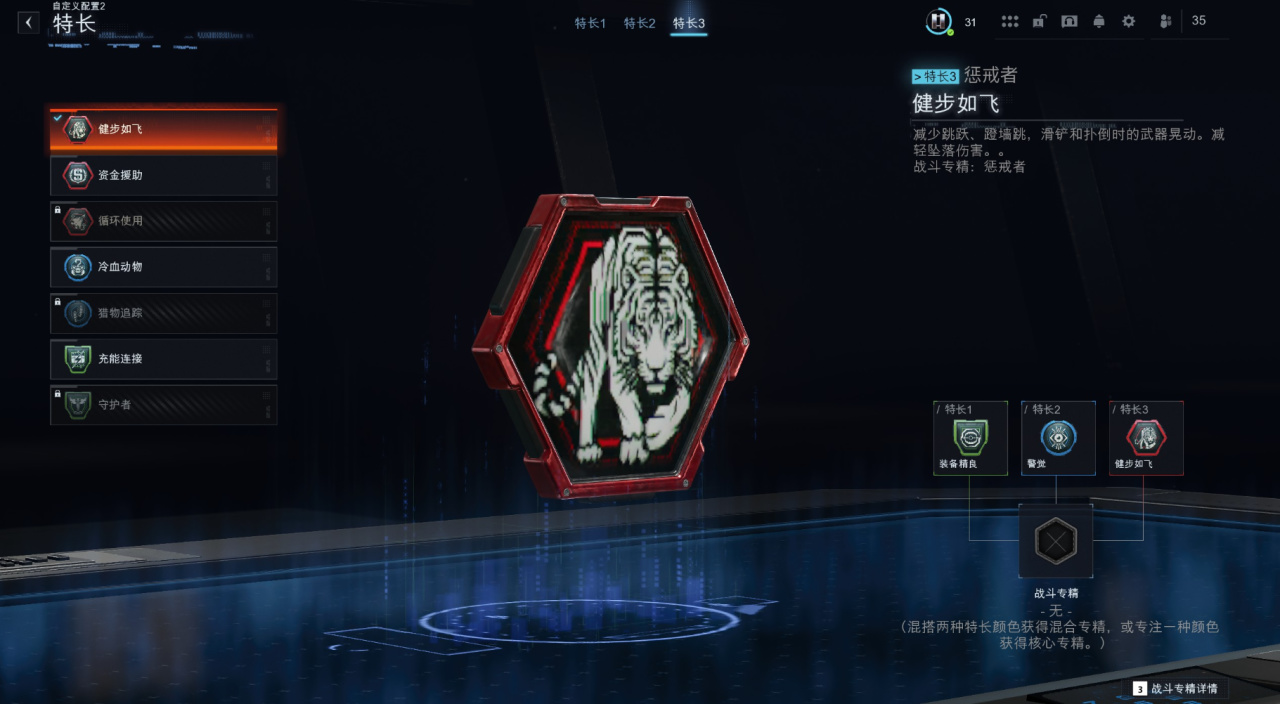 特长是被动技能,起到辅助作用,比如减少动作中的武器晃动、免疫敌人的电磁攻击等。