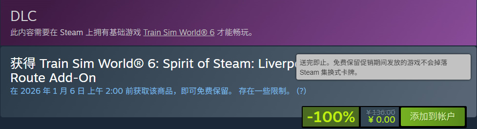 原价136元的DLC《模拟火车世界®6:蒸汽精神:利物浦莱姆街站—克鲁站》,于北京时间2026.01.06,2:00截止免费领取!