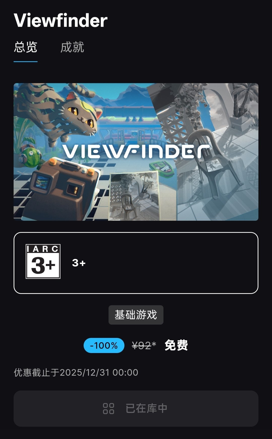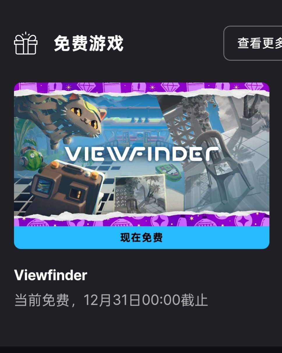 小伙伴们大家好呀,epic神秘游戏第13弹也解锁啦,今天送出的游戏是原价92的取景器。由于没找到epic的链接,这里放一个steam版的,大家可以看看介绍,然后直接去epic手动领取哦