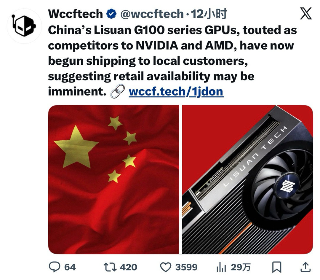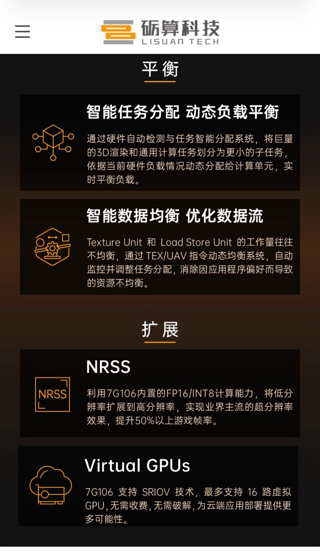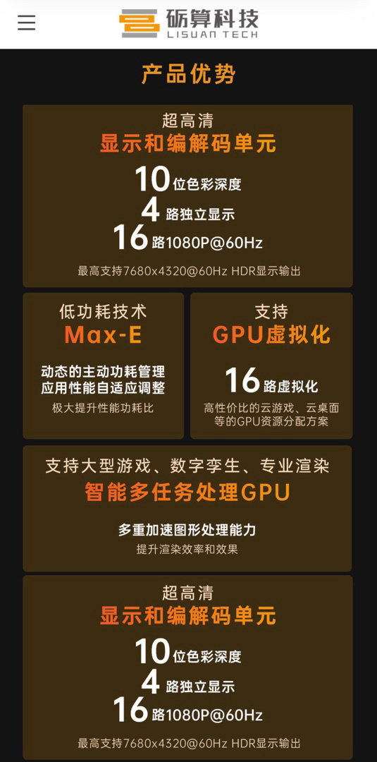 公开信息显示,砺算科技 7G100 系列 GPU 已于 2025 年 9 月 15 日正式启动量产,采用台积电 6nm 工艺制程,主要面向云游戏、智能座舱、数字孪生等应用场景