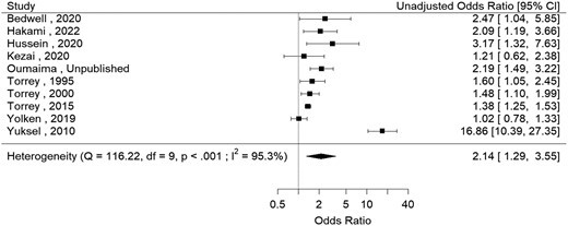 貓接觸與精神分裂症相關疾病之間隨機效應薈萃分析的森林圖,未調整分析