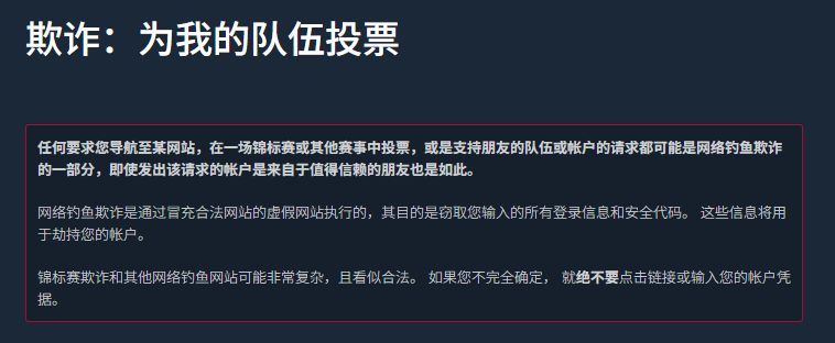 在十月三十号Valve社发布了重要更新,新增可疑聊天警告,当有陌生好友私信用“给我的战队投票”等理由向你发送可疑链接时会警告玩家面临的潜在风险。