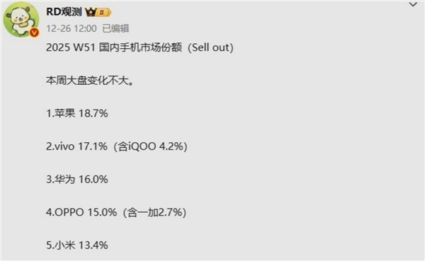 快科技12月30日消息,近日,博主“RD观测”送出了2025年第51周中国手机市场的份额数据,其中苹果凭借iPhone 17的热卖,成功超越华为重返第一。