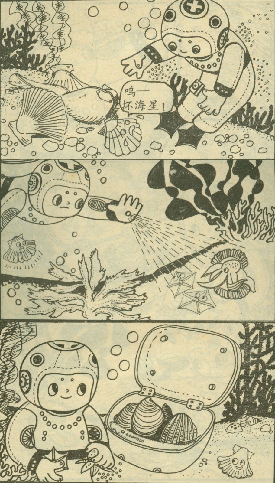 潜水娃很满意自己的收获。这时,忽然传来一阵哭声。走近一看,一只小扇贝守着一堆空扇贝壳,边哭边喊:“坏海星!呜—我长大了一定报仇!”