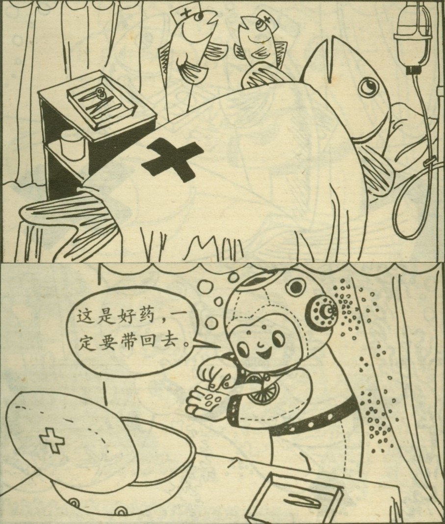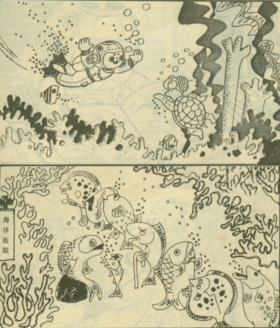 海洋医院坐落在珊瑚丛中,宽敞整洁。病鱼们排着队,安静地等候鱼大夫治病。鱼大夫热情地接待了潜水娃,可是他没有给人治病的药。鱼大夫只好贴出一张布告,号召海洋居民献宝药。