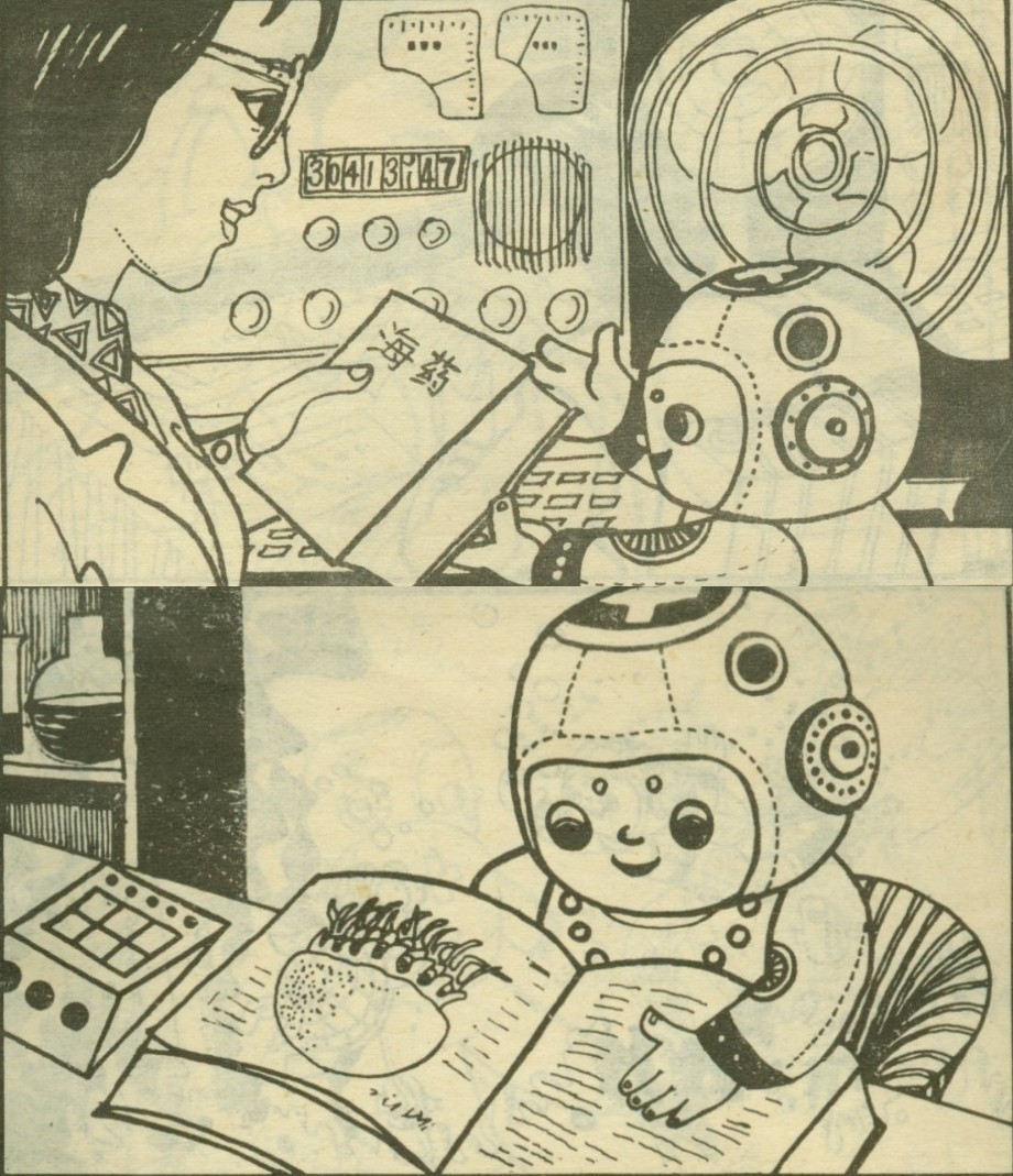 潜水娃在学习有关海药的知识。(完全把机器人潜水娃当成人类的小孩看书学习获取知识了。)