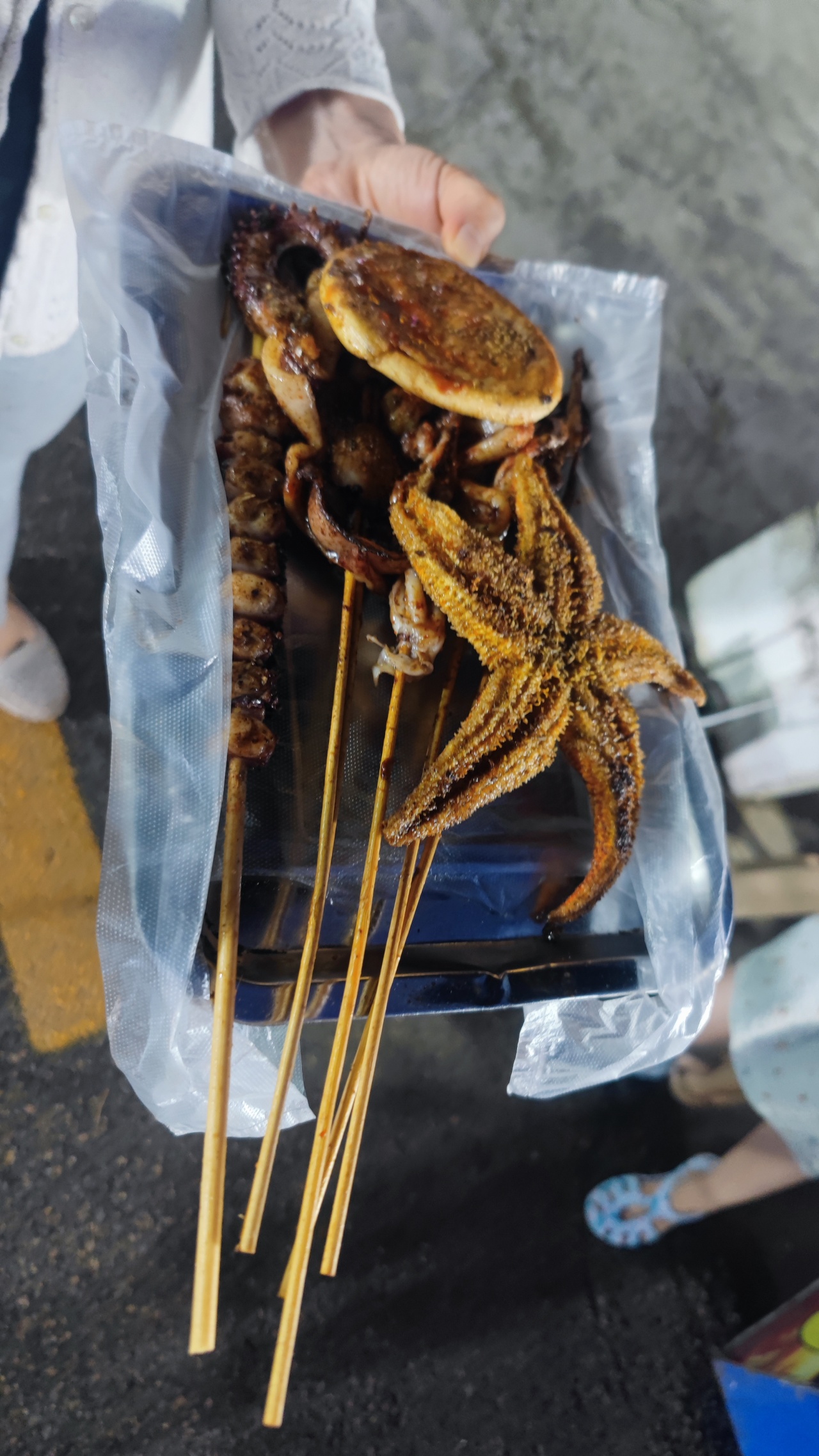22年自驾去海边,第一站是日照。当晚在海边吃的烧烤,我也是第一次见到了烤海星。来了一串问了老板怎么吃,告知只吃海星的凹处部分,实际上应该是海星籽。