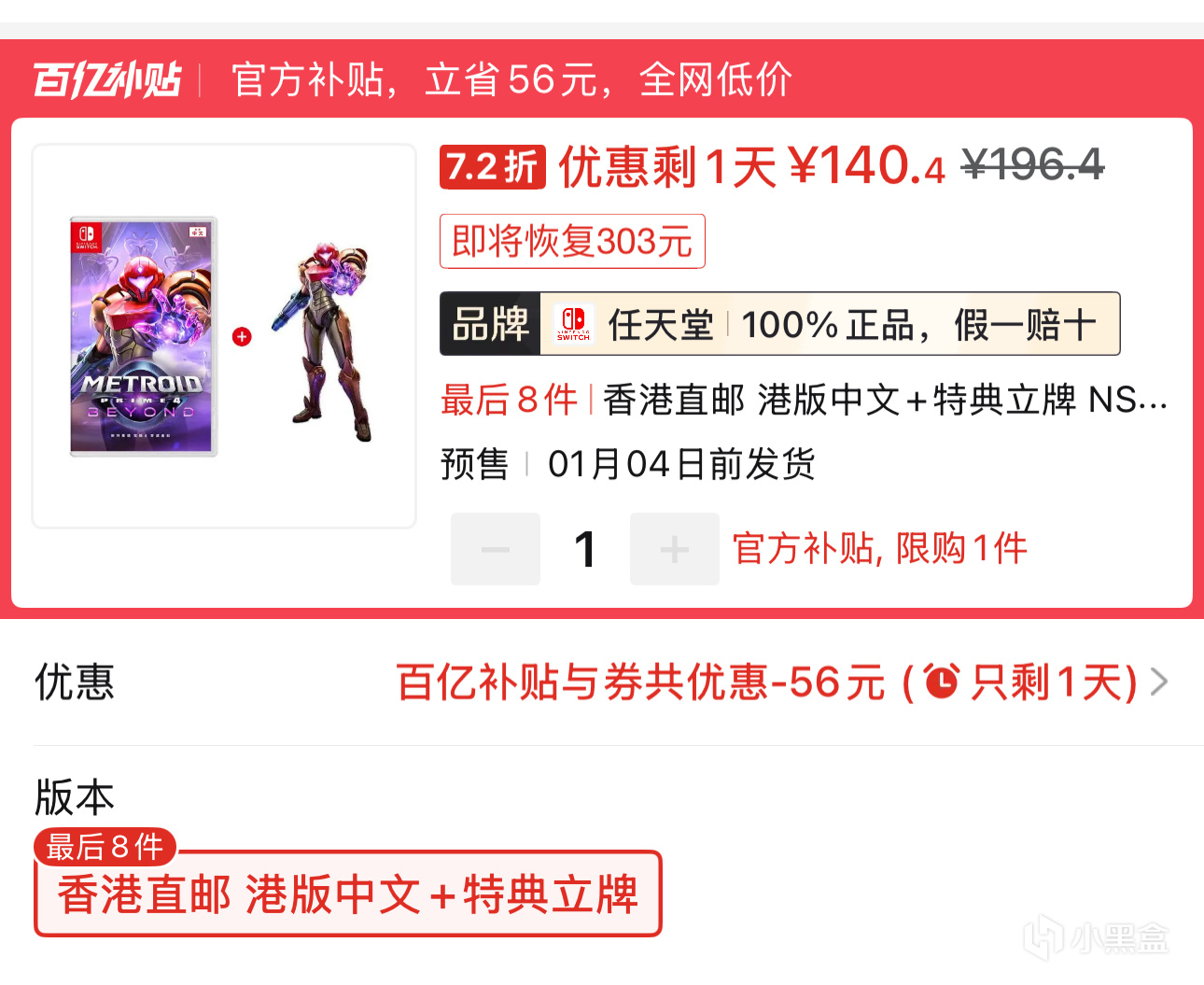 2.NS港版中文游戏《银河战士4》140.4元全新包邮,还附赠特典立牌。