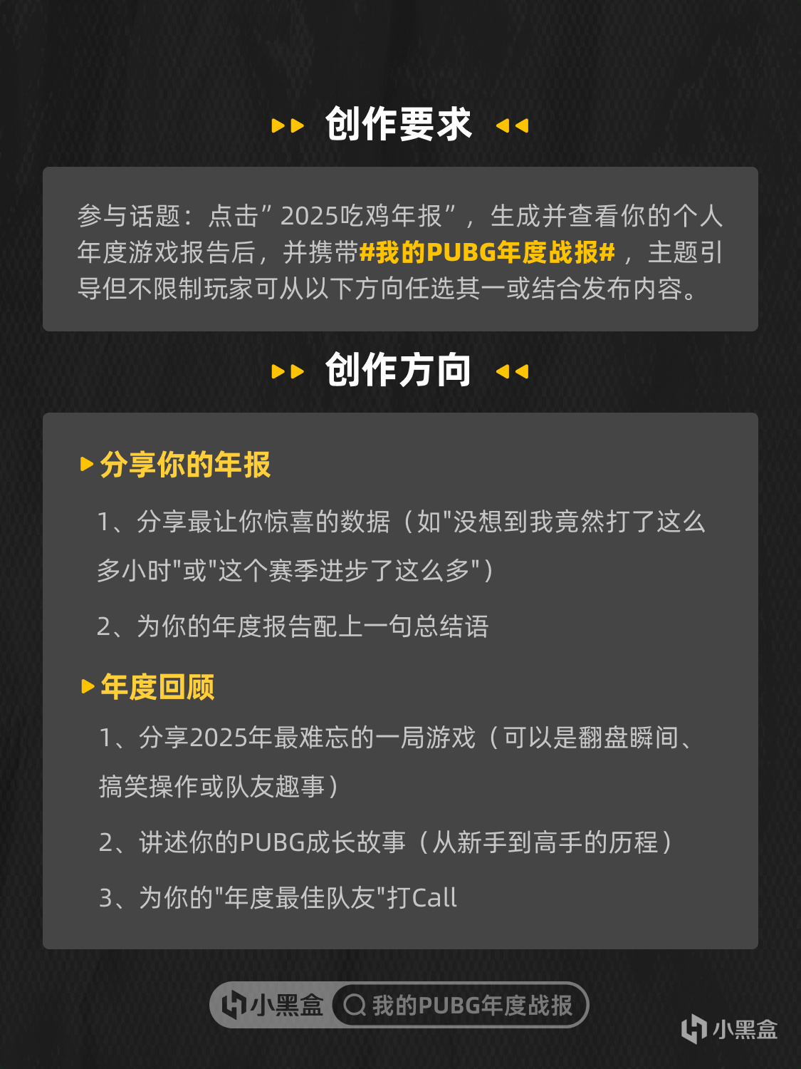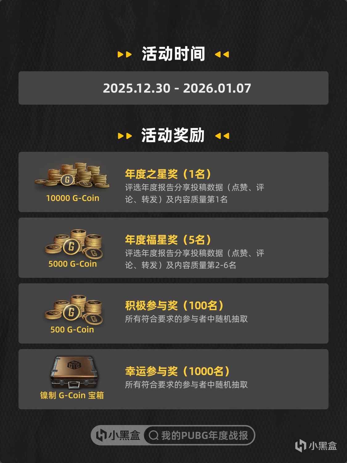 點擊”2025喫雞年報”,生成並查看你的個人年度遊戲報告,帶上#我的PUBG年度戰報#話題在 PUBG 社區發佈不少於30字的圖文帖或至少帶有1張圖片的文章並通過活動審覈即可參與活動。