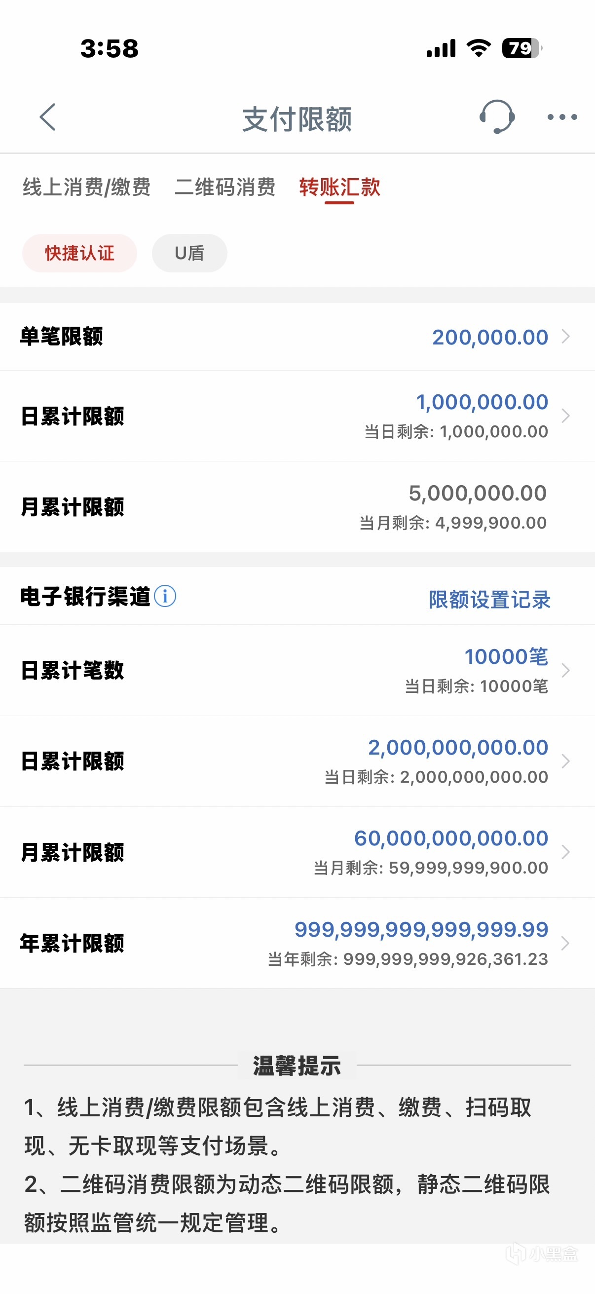 至於區分自己的工行卡片是否是一類一級賬戶,只需查看賬戶詳情下是否有限額數額,如上圖便是沒有非櫃面限額的一類一級賬戶,在進行刷卡消費等交易時無限額,但依舊受到細分渠道限制,如下圖。
