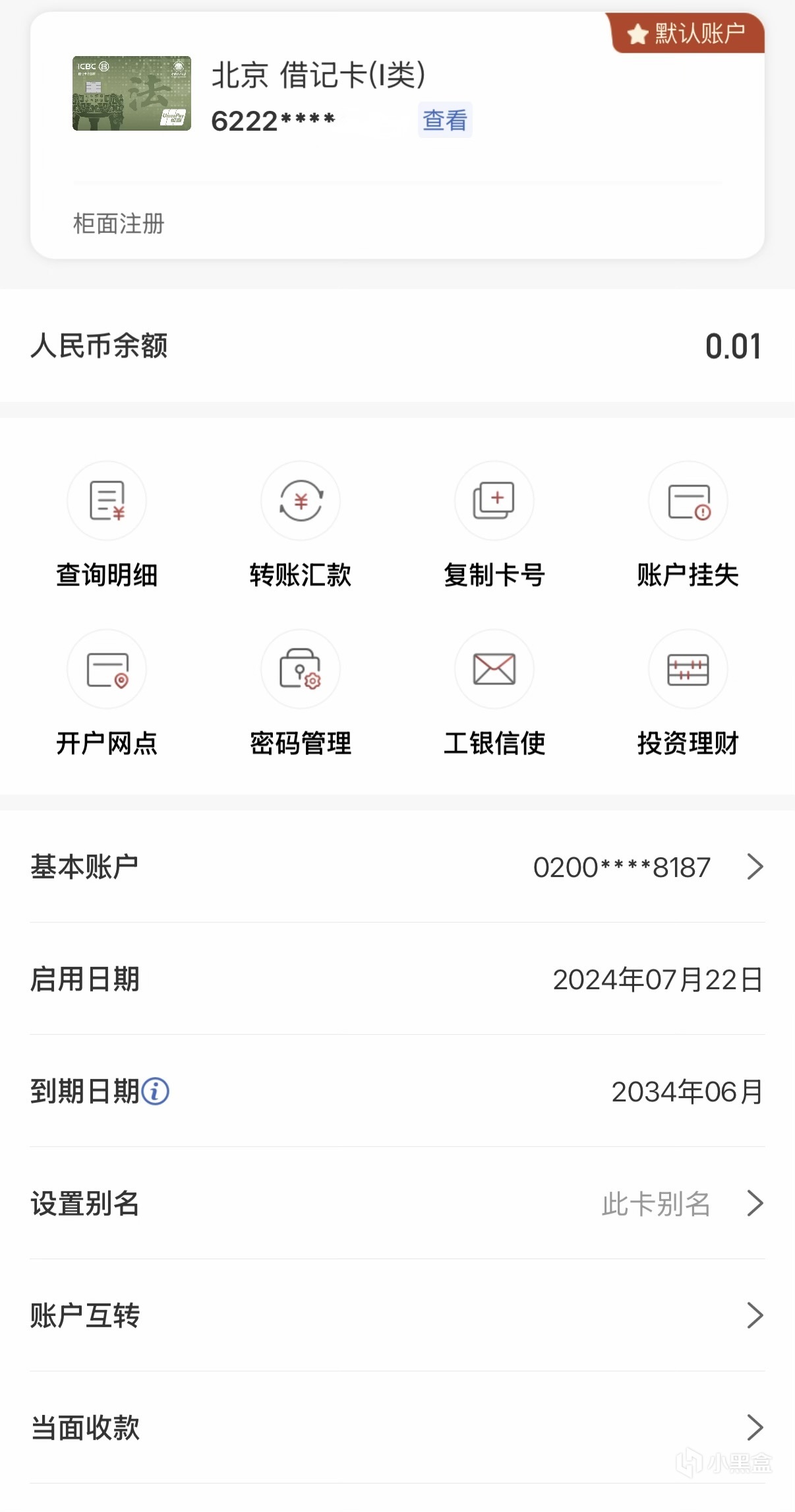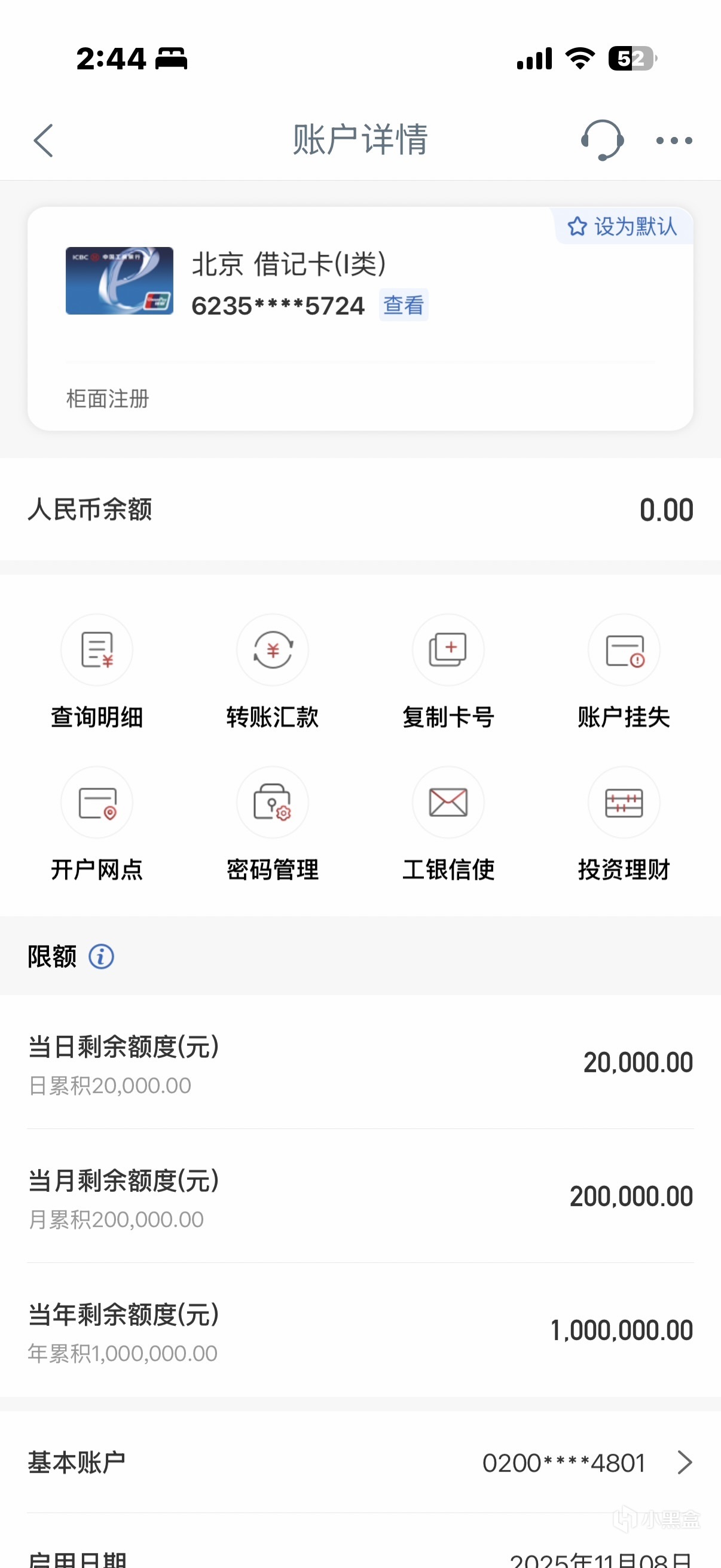 可以看到,在系統合併後,非櫃面限額進行了重製,參照了工行最新推出的賬戶分級分類管理標準,給到了一類三級賬戶,即日2W限額,而不是主播其他工行卡的一類一級不限額。與此同時開戶網點也更新爲改旗易幟後的工行(原錦州銀行)