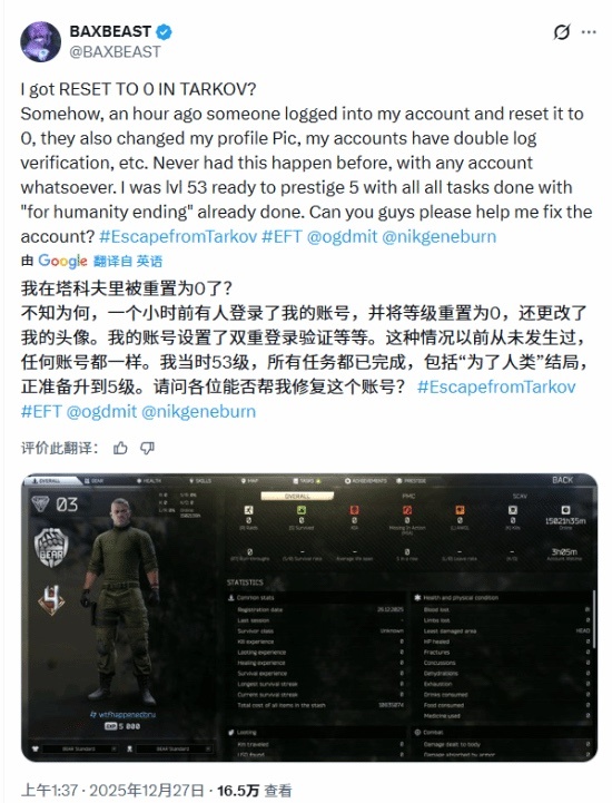 与《逃离塔科夫》相关的社交媒体话题标签和论坛中,充斥着账号存档被清空的玩家反馈,主播群体更是此次事件的重灾区。