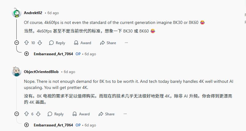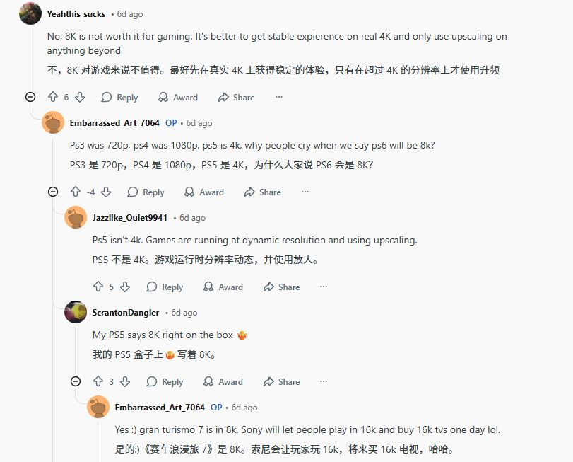 这一观点迅速引发网友争论,反对者认为,8K显示屏缺乏真正消费市场——索尼和LG已于2023年停产8K显示器,且这类设备价格昂贵,需要超大尺寸才能体现画质优势,与家庭使用场景不符。多数网友指出,索尼更可能将研发重点放在帧率优化而非单纯分辨率提升上。更现实的方案是4K分辨率搭配60-120帧组合,并辅以PSSR(PlayStation光谱超分技术)实现8K超分渲染,在保证画质的同时维持流畅体验。