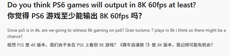 PS5上市五年后,玩家社区关于PS6规格的讨论日益热烈。有玩家在Reddit论坛发帖称,PS6有望实现所有游戏8K分辨率、60帧运行的目标,理由是PS5已支持4K输出甚至能在《跑车浪漫旅7》中实现8K显示。