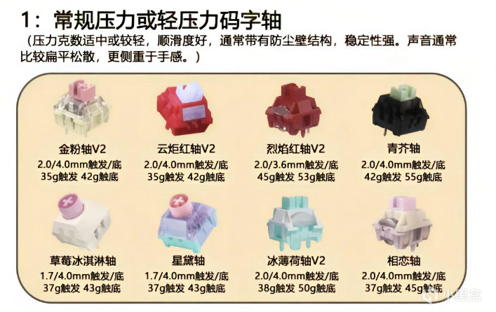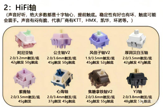 軸體:這是機械鍵盤的靈魂,不同軸體手感差異極大,現在的軸體名字天花亂墜的,記住這些軸體的參數特點就行了。