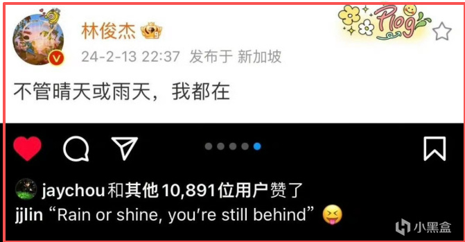 直到這次官宣文案重現 “無論晴天或雨天,都堅守在彼此身邊”,才懂 “我” 是承諾,“你” 是暗指七七的存在。(周杰倫給他的帖子也點讚了,這倆人互動還挺頻繁。)