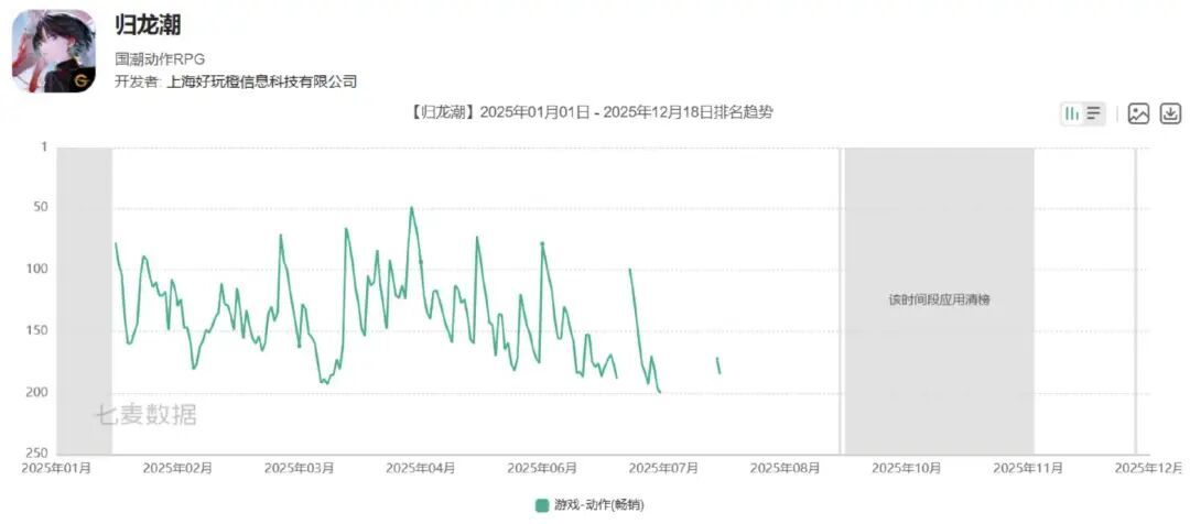 FunPlus《归龙潮》位列榜单第128名,流水约为417万。这是一款国潮风格的横板动作游戏,收获过不错的关注度,其公测PV和实机PV在B站分别获得了981万和770万播放量,一度被誉为是2024年最受期待二游之一。但游戏上线后表现不达预期,最高排在国内iOS畅销榜23名,2个月后掉出榜单前200名,最终在周年庆前宣告停运。