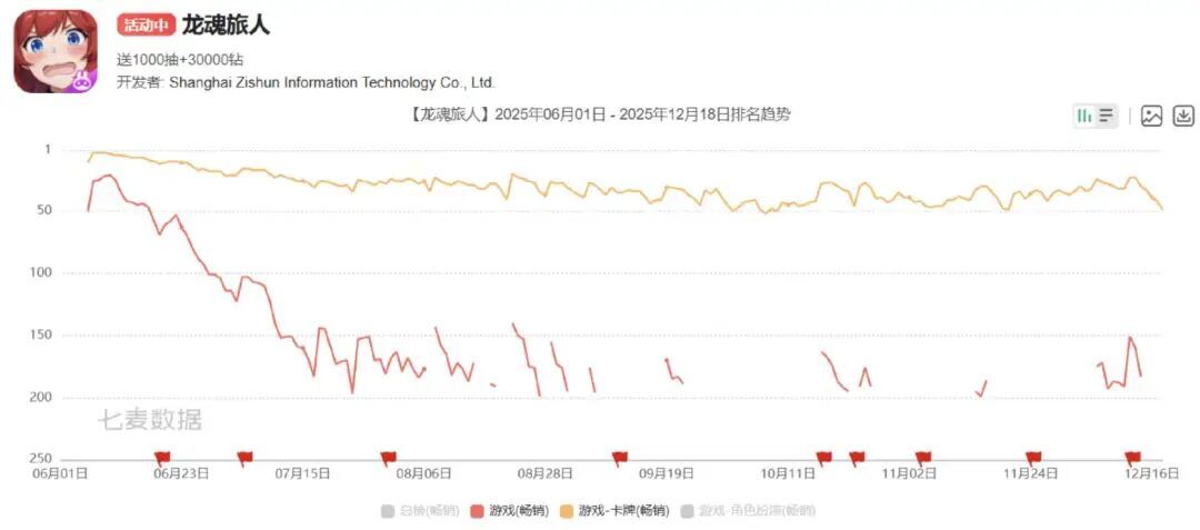 紫龙《龙魂旅人》是一款二次元放置卡牌,这家厂商以战棋闻名,但近年来也在不断尝试其他品类的游戏,《龙魂旅人》在今年6月上线,最高到达iOS游戏畅销榜第21名,此后下滑较快,8月就已基本掉出畅销榜单。