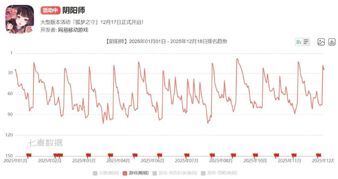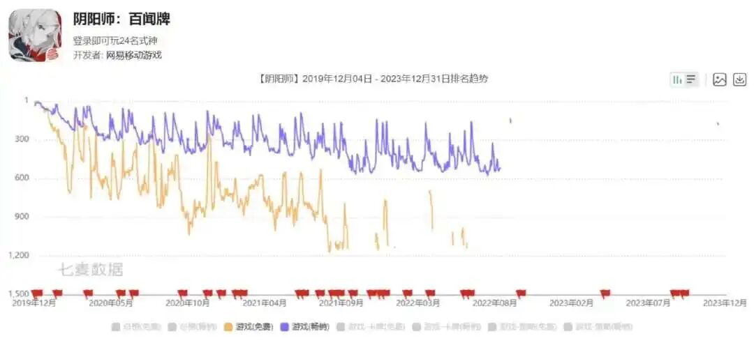 网易《阴阳师:百闻牌》是一款《阴阳师》IP的CCG游戏,于2019年12月12日全平台公测,上线后最高曾到达过iOS游戏畅销榜第12名的位置,但后续下滑较快,在iOS游戏畅销榜TOP200-600之间待了一段时间后,2022年9月后彻底掉出畅销榜单。最终在来到六周年之前,游戏按下了暂停键。