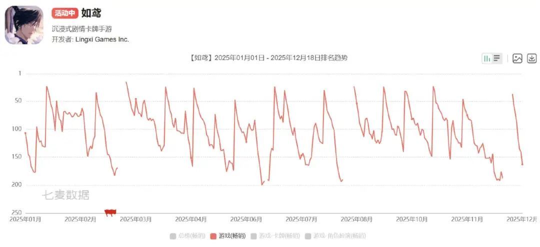 灵犀互娱《如鸢》排在榜单第12名,这是一款2024年推出的沉浸式剧情卡牌游戏。游戏新知前不久刚介绍过这家厂商,《如鸢》突破了灵犀互娱原先的产品矩阵,扩展了优势品类。游戏近一年维持在iOS游戏畅销榜TOP100左右,流水约为1.29亿元。