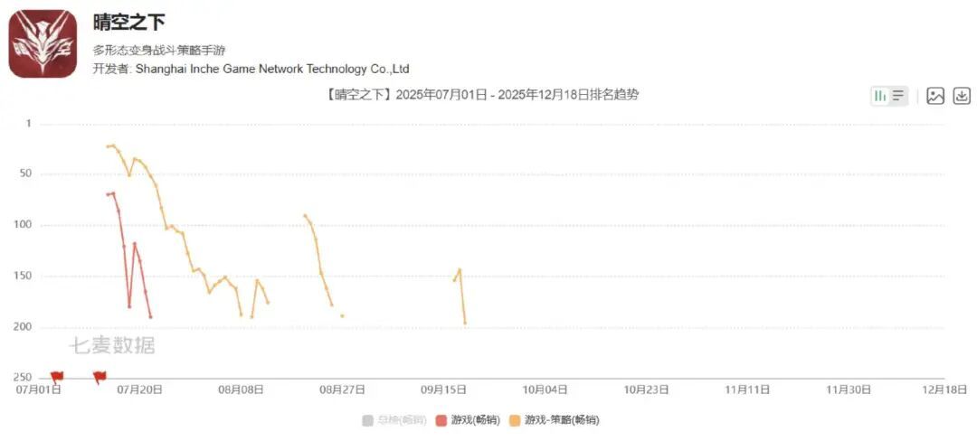 英澈网络《晴空之下》是一款特摄题材的战棋游戏。游戏在7月份上线,最高到达过iOS游戏畅销榜第69名,一周后掉出畅销榜TOP200,而后没有回升的走势。研发方英澈网络在近期被曝出拖欠物业费用,也因为委托创作合同纠纷、服务合同纠纷、广告合同纠纷而受到多家公司起诉。