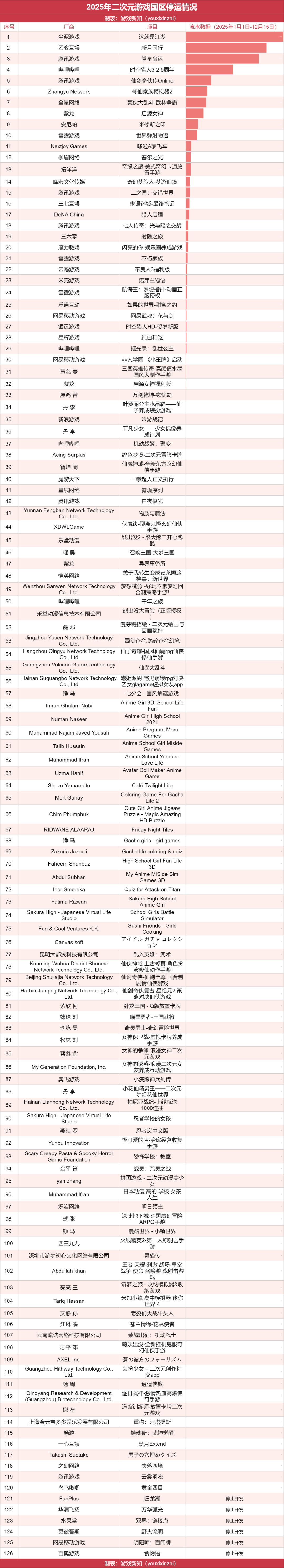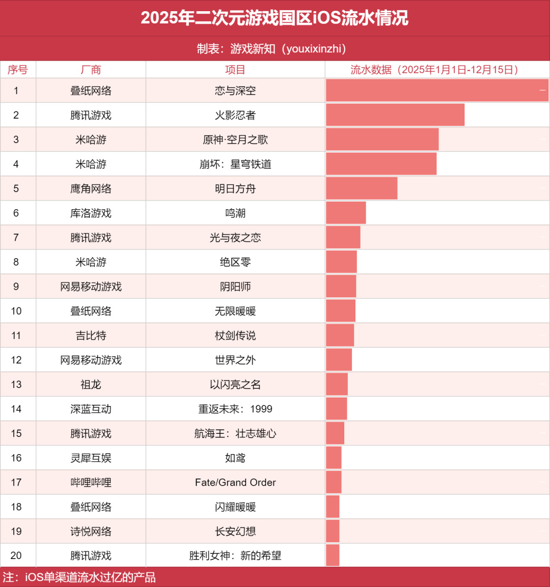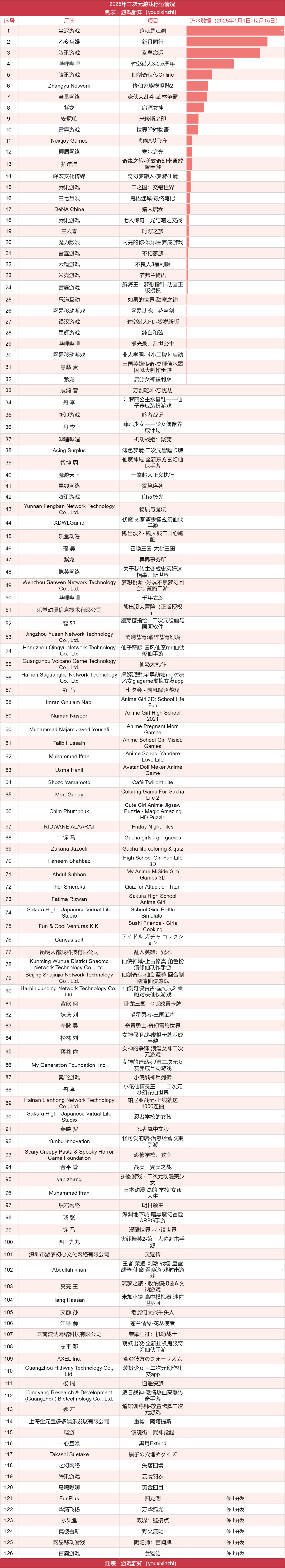 注:1.数据来源于Sensor Tower(2025年1月1日-2025年12月15日),二次元产品的判定标准较为宽松,仅供参考。2.该榜单仅反映游戏在中国区iOS渠道的表现。3.如有遗漏,欢迎补充。