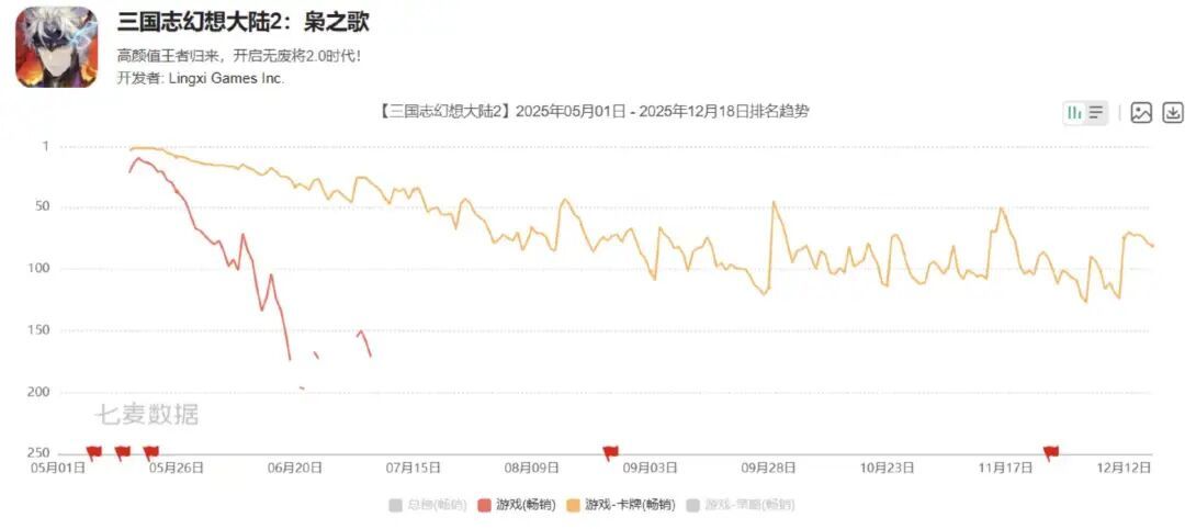 灵犀互娱《三国志幻想大陆2:枭之歌》则是《三国志幻想大陆》的正统续作,其卡牌设计和关卡叙事玩法算有些特色,游戏在今年5月份上线,最高到达过iOS游戏畅销榜TOP10,但后续很快下滑,不到两月时间就已掉出畅销榜单。