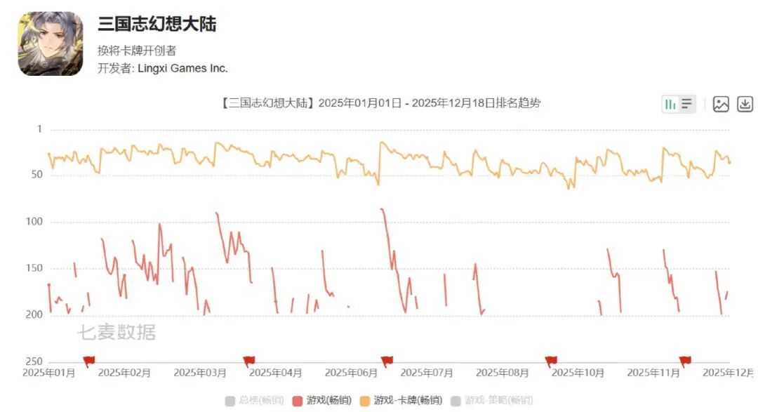 灵犀互娱《三国志幻想大陆》位列榜单第43名,这是一款策略卡牌游戏,一度冲到过iOS游戏畅销榜TOP3,至今运营时间已超5年,近一年仍能维持在卡牌分类畅销榜TOP40左右,流水约为3532万元。