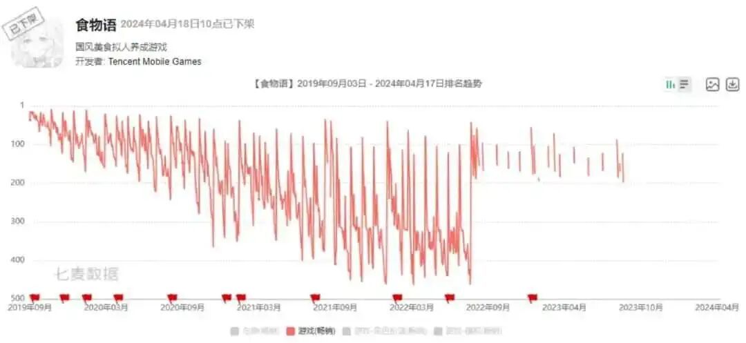 腾讯《食物语》是一款女性向游戏,由百奥游戏负责研发。游戏在2019年9月上线,首月流水破亿,之后的运营走势也比较稳定,直到2022年9月才逐渐掉出iOS游戏畅销榜TOP500,最终在去年4月17日宣告停运,停运消息还冲上了热搜第一。后续,游戏上线了免费的陪伴版,一度冲上了iOS游戏免费榜第14名,算是有个比较体面的结局。