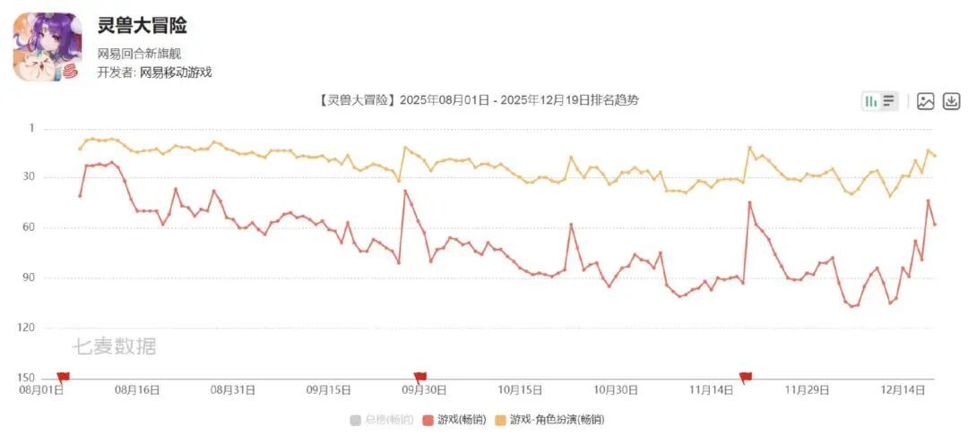 网易《灵兽大冒险》位列榜单第24名,流水约为6286万元。这是一款今年8月上线的轻量化MMORPG,整体风格似乎对标的是《长安幻想》,游戏近半年维持在iOS游戏畅销榜TOP60左右,近期还有一些回升趋势。