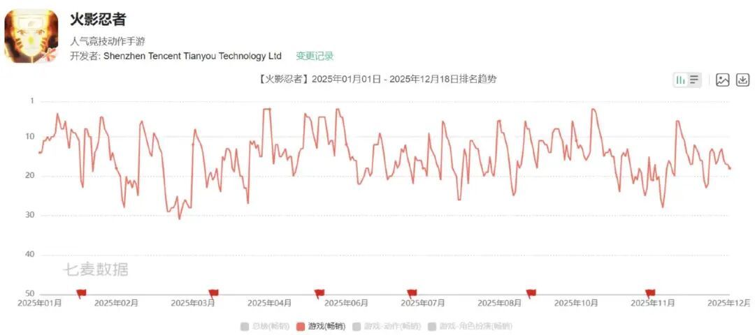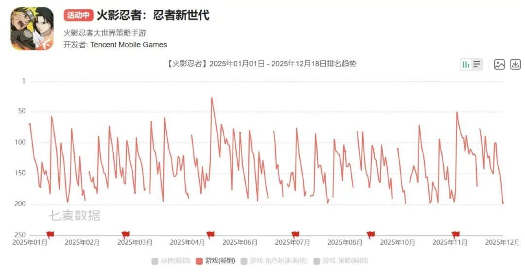 腾讯还有另一款漫改IP《火影忍者:忍者新世代》也在悄悄发财。与《火影忍者》不同,这是一款大世界回合制卡牌手游,游戏位列榜单第21名,近一年维持在iOS游戏畅销榜TOP150左右,流水约为6631万元。