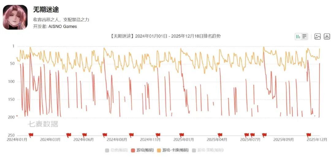 《无期迷途》位列榜单第27名,流水约为5871万元。这是一款2022年上线的塔防即时战略游戏,由自意网络研发,其题材和剧情在二游市场中算得上是比较细分的产品,一度冲到过iOS畅销榜第6名,后续游戏稳定在iOS游戏畅销榜TOP200左右,从卡牌分类畅销榜来看,其走势甚至还有些回涨的势头。