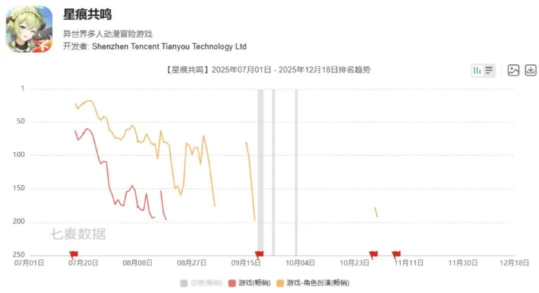 腾讯《星痕共鸣》是一款二次元风格的MMORPG,背靠万代南梦宫旗下IP《蔚蓝法则》,由上海宝可拉负责研发,其创始人曾担任过《龙之谷手游》研发负责人和《仙境传说:爱如初见》项目制作人。这款游戏在去年首曝,产品选用了一套新的思路,即试图将二次元受众带入MMO的坑,而非在二次元受众中挖掘MMO受众。但这套思路在国内似乎并不奏效,而《星痕共鸣》开服也屡屡崩溃炸服,游戏最高曾到达iOS游戏畅销榜第60名,后续排名急转直下,9月就已彻底掉出畅销榜单。