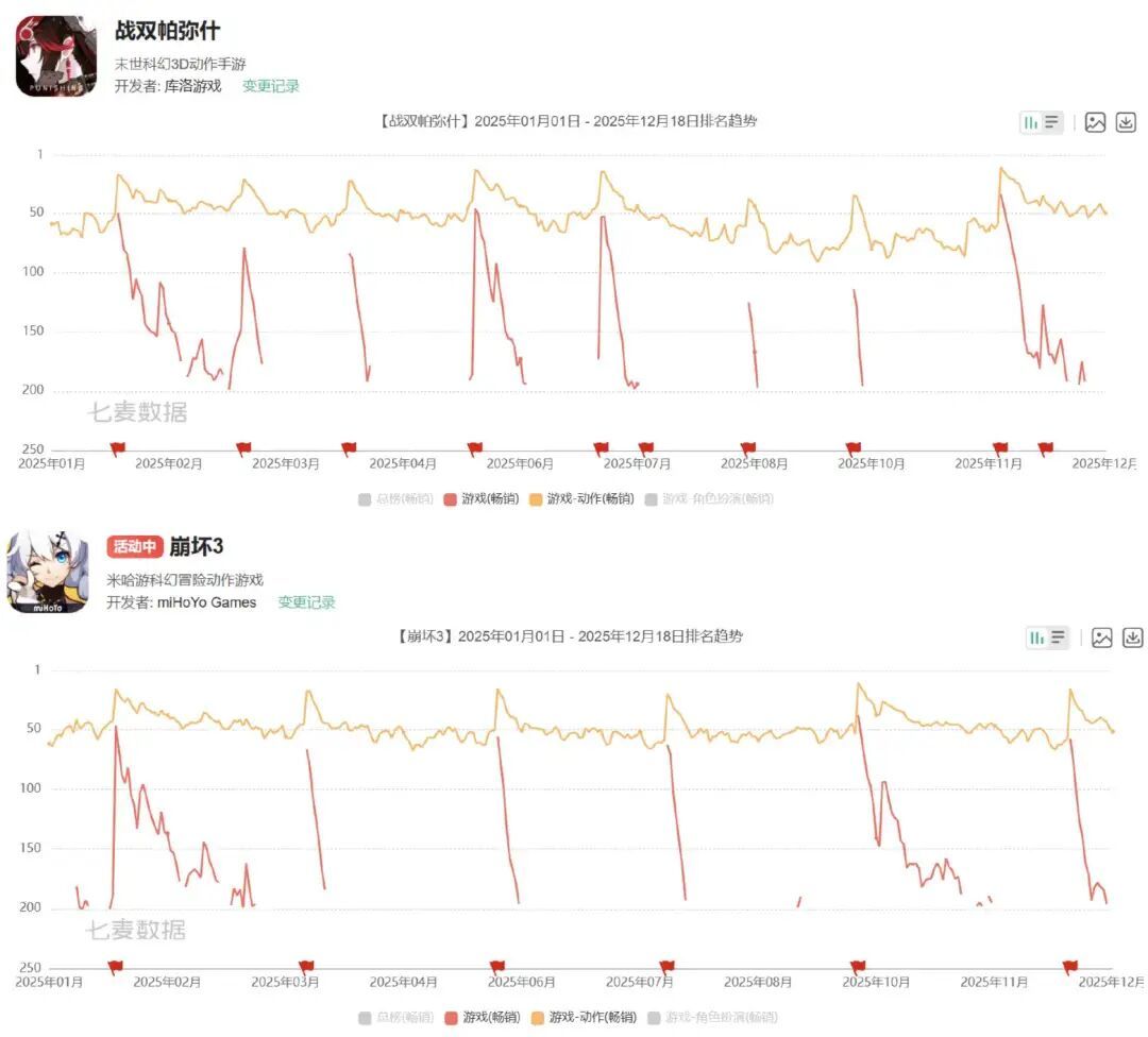 库洛游戏《战双帕弥什》和米哈游《崩坏3》分别位列榜单第34名和第35名,这两款产品则属于动作分类赛道。其中《战双帕弥什》近一年维持在iOS动作分类畅销榜TOP50左右,流水约为4948万元;《崩坏3》同样维持在iOS动作分类畅销榜TOP50附近,流水约为4890万元。