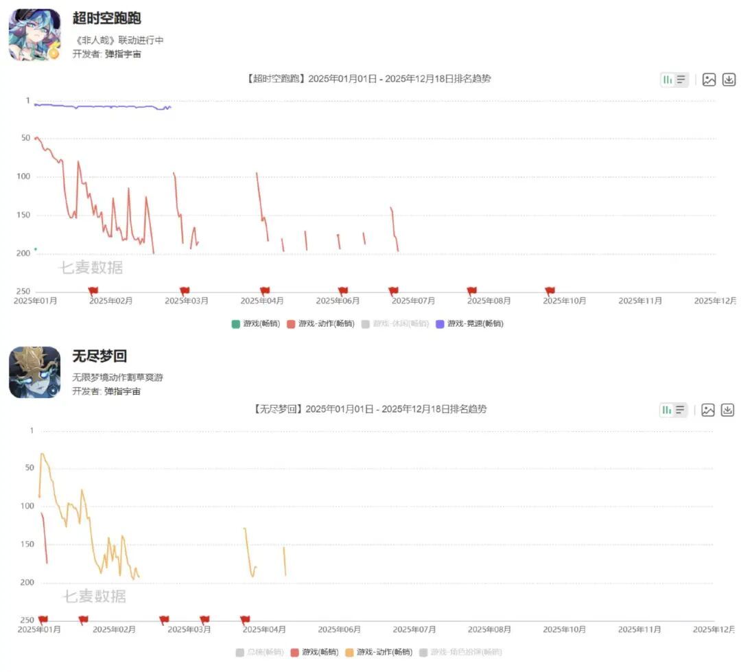 弹指宇宙旗下的两款二游《超时空跑跑》和《无尽梦回》都未能取得多少成绩,前者是一款二次元风格的跑酷游戏,最高曾到达过iOS游戏畅销榜第149名,不到一周就掉出畅销榜单;后者是一款Roguelike俯视角ARPG,最高曾到达过iOS游戏畅销榜第33名,随后一直下滑,今年1月后就掉出畅销榜单。