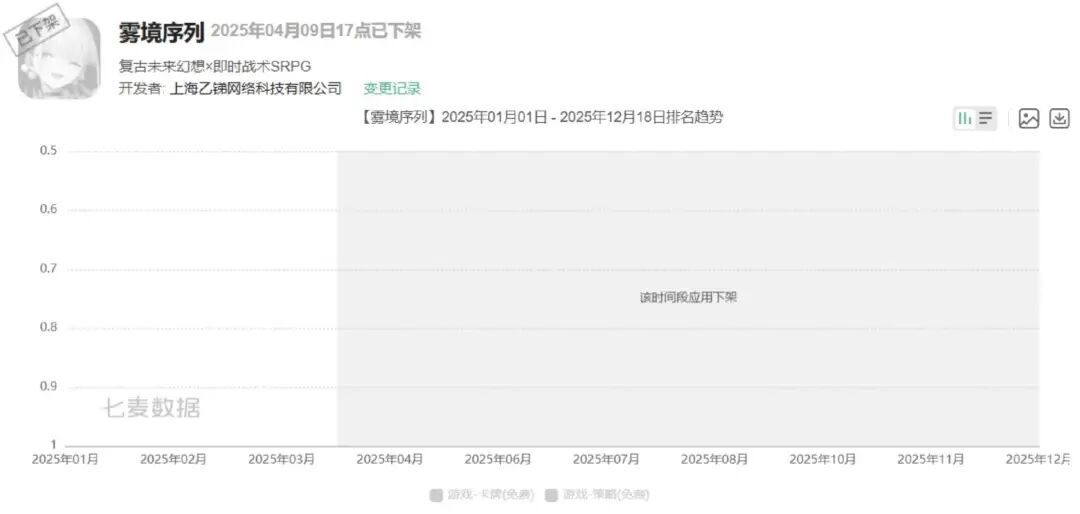 星线网络《雾境序列》是一款以复古未来架空世界为背景的RTT游戏,于2023年11月公测,当时拿到过iOS游戏免费榜第4、畅销榜第45名的成绩,然而上线不到半月便跌出畅销榜200名之外,最终在今年3月份宣告停运。