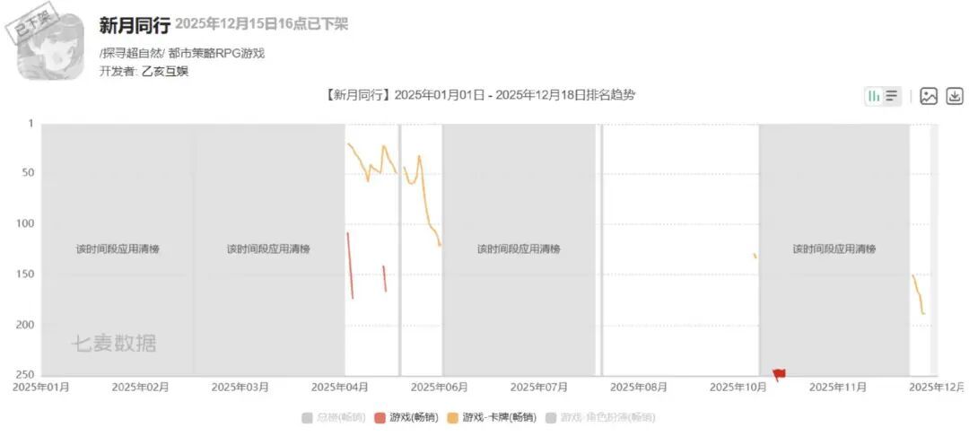 烛薪网络《新月同行》是一款新怪谈题材的二次元回合制卡牌游戏,项目组请来了网文作家白伯欢担任主笔,其画面和剧情都颇有老广风味。游戏于2024年10月24日正式上线,但成绩并不理想。《新月同行》一度冲到过iOS游戏免费榜榜首、iOS游戏畅销榜第27名,但随后成绩下滑较快,主笔也因身体原因离职,产品在很长一段时间还遭遇了清榜,畅销榜排名也每况愈下。项目熬过了周年庆,但不久就宣布新版本即将延期,12月15日,《新月同行》顺利上线了新版本,但随后几个小时就正式发布了停更公告,令人唏嘘。