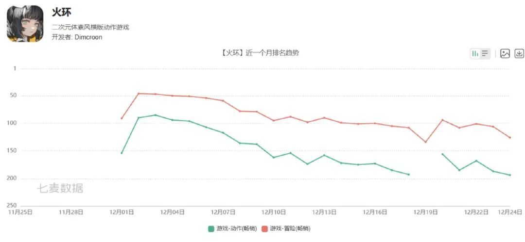 月胧吟《火环》是一款二次元体素风横板动作游戏。这款游戏在2022年首曝,其首曝PV在B站就拿下了162万播放,曾拿到过叠纸的投资(占股7.67%)。据公开报道,创始团队几乎没有多少行业经历,也缺少项目管理经验——这也就导致游戏研发期间摇摆不定,研发超5年终于上线。但《火环》在上线后并未取得多少成绩,游戏最初只登陆了安卓和TapTap渠道,其中TapTap评分仅为4.5分,下载则为32万。后续,《火环》在12月初登陆了iOS渠道,但连畅销榜都未曾挤进去,后续走势也一路下滑。