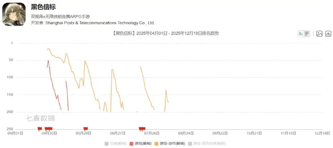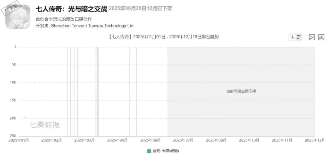 腾讯《七人传奇:光之暗之交战》是一款由讲谈社授权、韩国厂商Netmarble研发的竖屏卡牌RPG手游,其采用了「二合一卡牌战斗」的玩法,曾在海外拿到过不错的成绩,但在国内似乎水土不服。游戏在2023年10月份上线,最高到达过iOS游戏畅销榜第35名,运营不过4月就已掉出了畅销榜单。