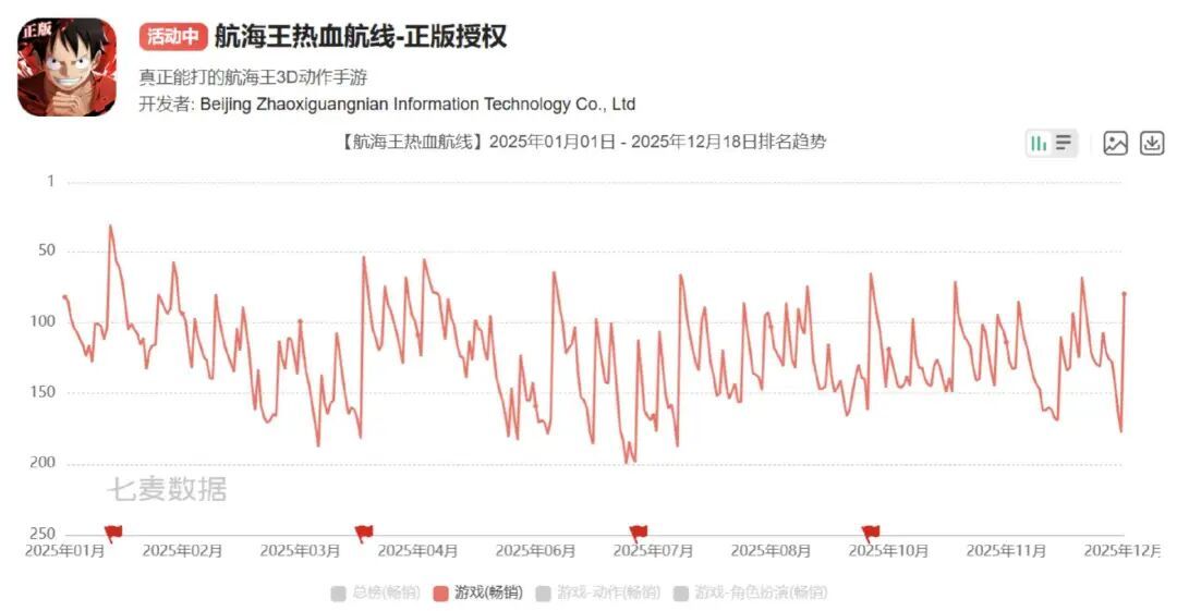 字节跳动《航海王热血航线》排在榜单19名,这是一款2021年上线的漫改IP动作游戏,运营时间已超4年,在漫改IP游戏中已经算是较为少见的成绩。游戏近一年维持在iOS游戏畅销榜TOP150左右,流水约为7369万元。