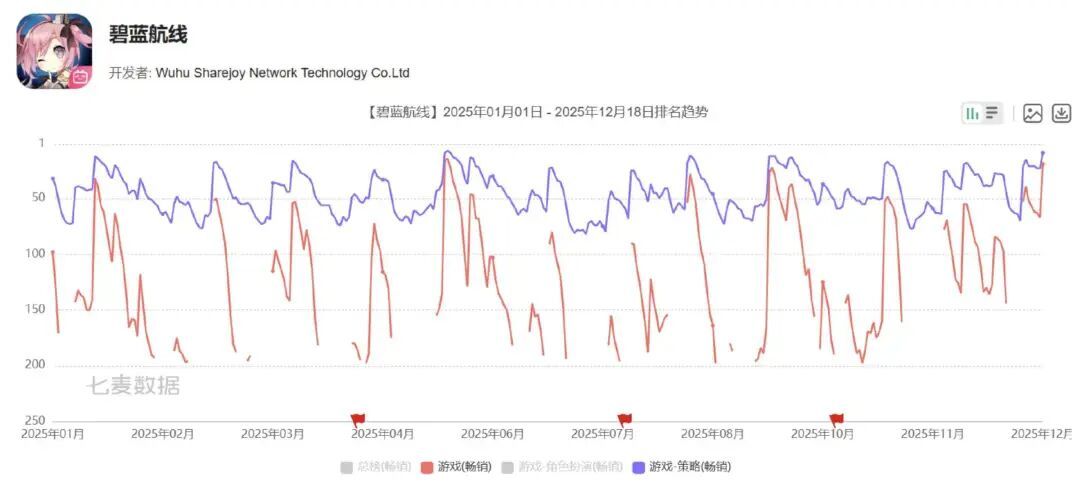 哔哩哔哩《碧蓝航线》位列榜单第16名,这是一款2017年上线的长青二游,靠着优秀的美术素质和良心的运营态度在业内占下一席之地。游戏近一年在iOS游戏畅销榜的排位不算特别稳定,但通过策略分类畅销榜来看,游戏流水其实相当稳定,据Sensor Tower数据,《碧蓝航线》2025年在国内iOS渠道收获了9078万元流水。