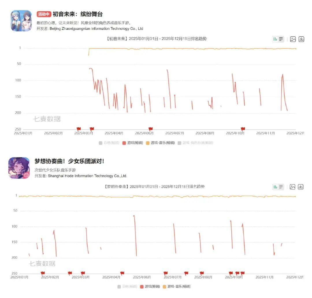 字节跳动《初音未来:缤纷舞台》和哔哩哔哩《梦想协奏曲!少女乐团派对!》分别位列榜单第29名和第36名,这两款产品都属于较为小众的音游赛道。其中《初音未来:缤纷舞台》在今年3月份上线,最高曾冲到过iOS游戏畅销榜第63名,后续下滑较快,但其在iOS音乐分类畅销榜至今未掉出过TOP5,今年流水约为5757万元;